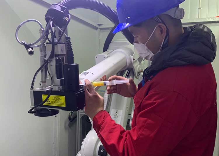 This procedure uses specialized equipment to measure the iron particle concentration in the grease within each robot joint reducer (specifically RV reducers).